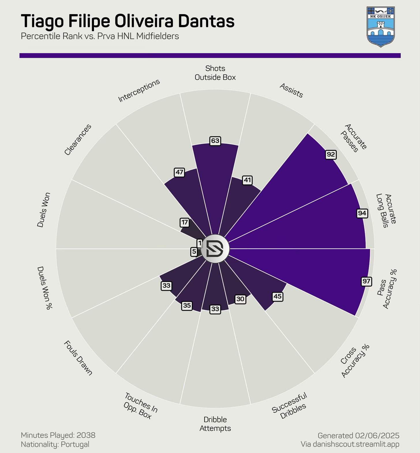 He’s not your modern day box to box athlete. He works hard off the ball (7.5 recoveries per 90) but he’s not a duel merchant. You gave him the ball and let him go to work. He passes, he creates.A Barry Bannan type. Massive credit to the Croatians (Osijek are 5th in HNL) for picking him up, the data was all there from his loan at AZ Alkmaar. He’d probably wouldn’t be a week-in week-out signing, but a point of a difference to help you unlock a defence.