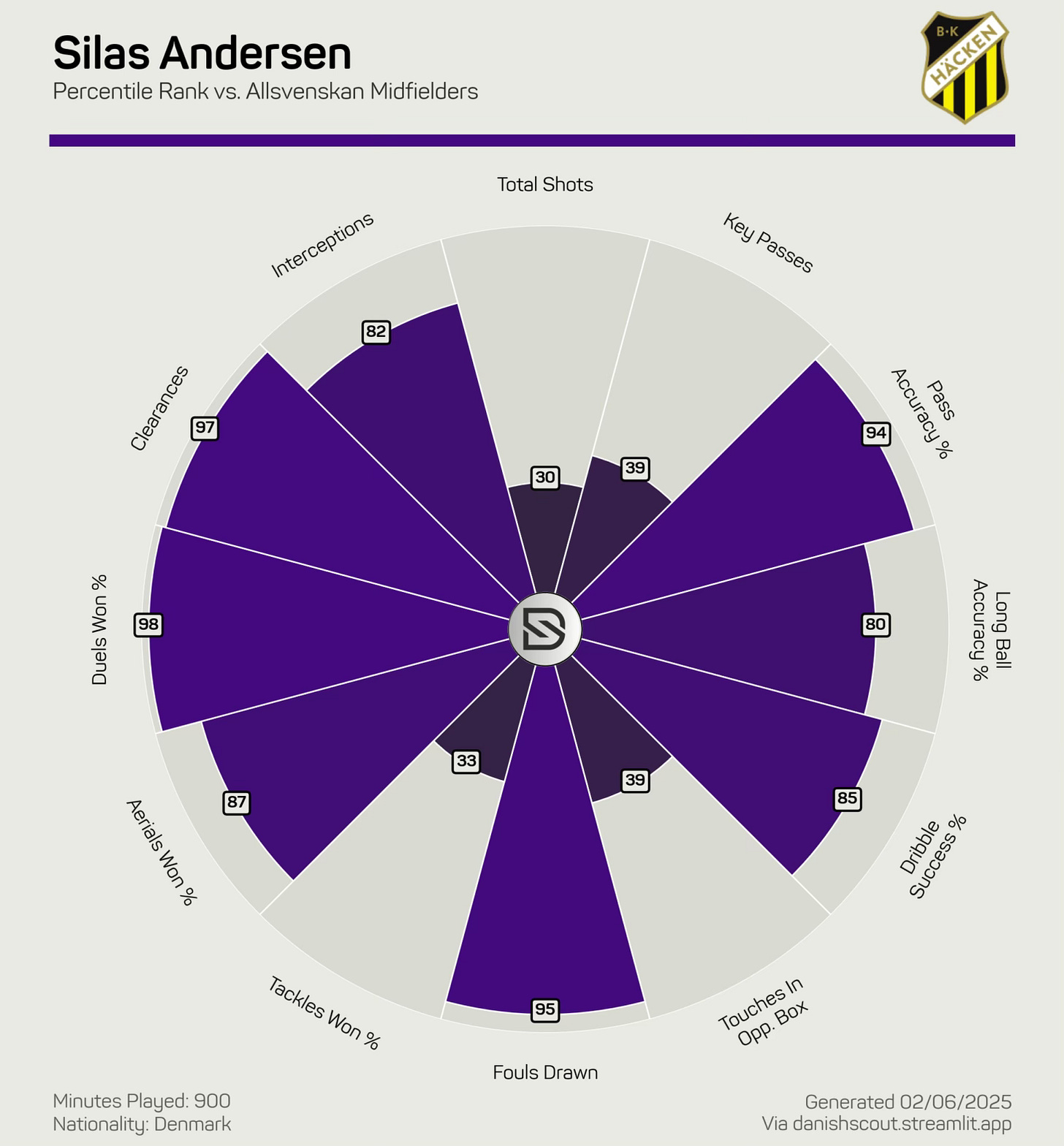 The Danish youngster moved early from FC Copenhagen to Inter Milan. Unable to break through, he moved to FC Utrecht and despite excellent performances for their B side in the Dutch 2nd tier, again no breakthrough. That led to a €1million move to Hacken in January, and now aged 20 he’s quickly shown he’s too good to be playing in Allsvenskan.