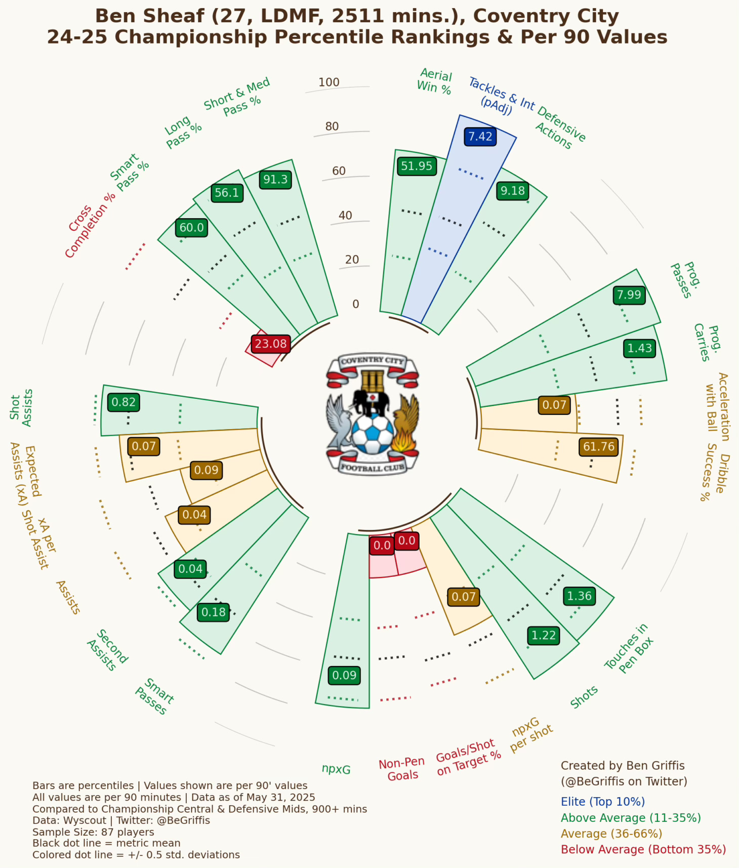 Really tidy on the ball, he gets through a huge amount of defensive work. 9 recoveries per 90 is higher than Sheaf managed in the 23/24 season. He’d be an ideal foil for the other more creative midfielders, and his off the ball work would leave Coventry less exposed to counter attacks. Transfermarket have him valued at €2.2million, there’s no info on his contract length.